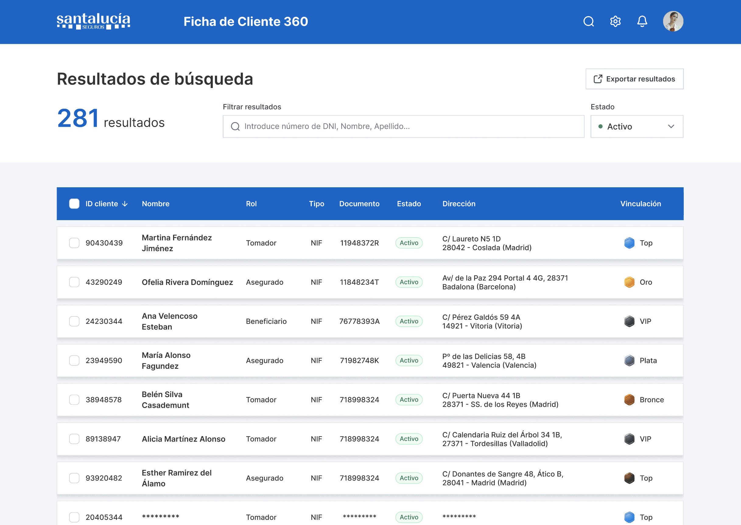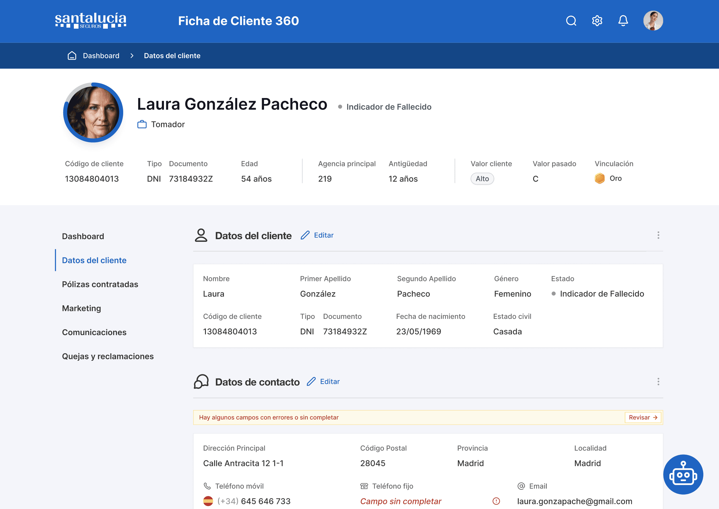 As a leading force in the insurance business in Spain, Santalucía faces challenges with an outdated client management platform causing inefficiencies. Users encounter obstacles in their daily tasks due to the system's technical obsolescence. These limitations hinder Santalucía's ability to deliver optimal services and personalized experiences, highlighting the need for a modern, adaptive client management solution.